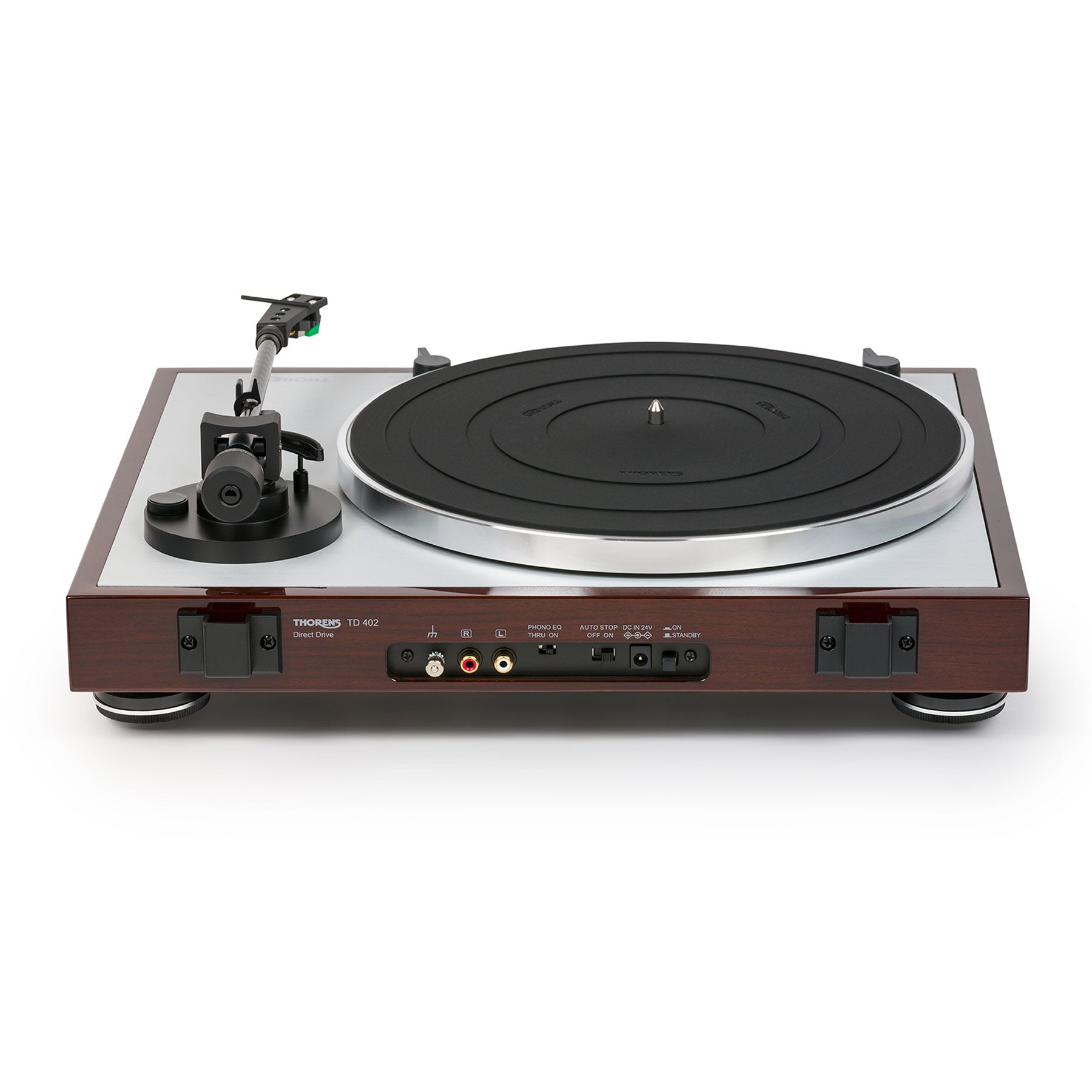 "The Thorens TD 402 DD has a one of our favorite feature sets for an intermediate turntable: a no-fuss, quiet direct drive motor; the popular VM series cartridge, and a convenient auto-stop function. The cap is the great looking 2 piece body with high-gloss wood frame contrasting with the metal top." - TTL